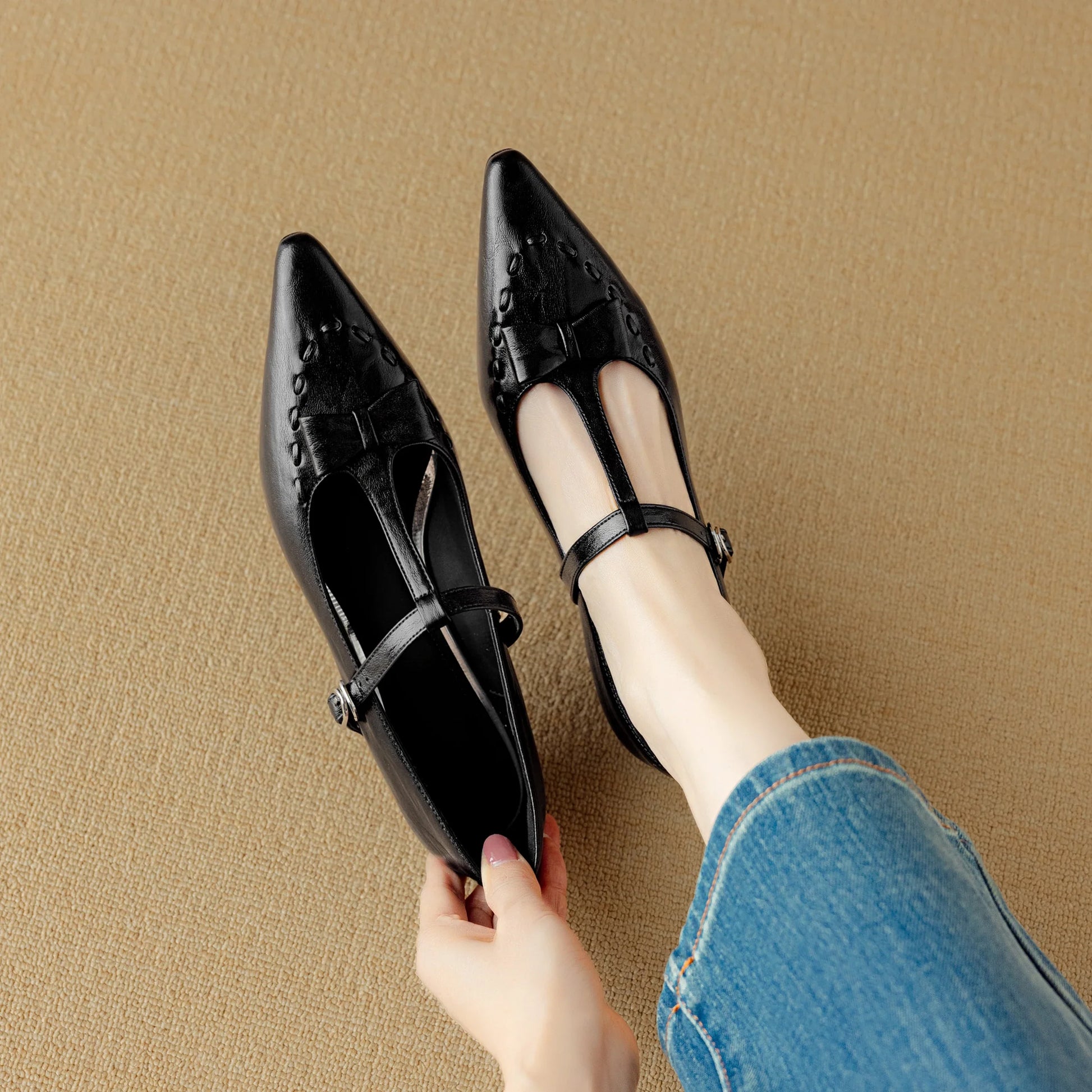 Adorned with a charming bow and a classic T-strap, these pointed-toe pumps are made from genuine leather with soft cushioning, elevated by a sleek wedge heel for lasting comfort.